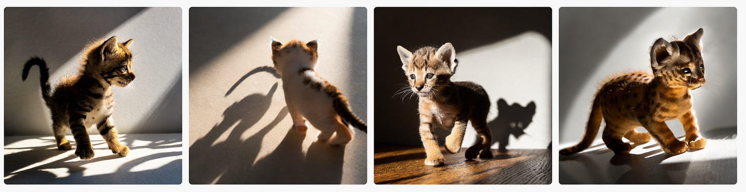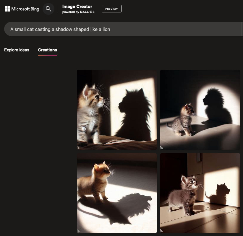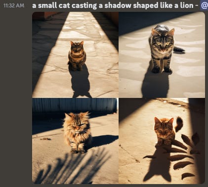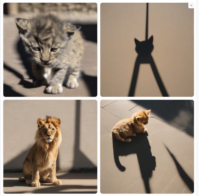 It seems the only two AIs to really capture the idea of casting a shadow were Midjourney and Dall-E 3. And of those, only Dall-E 3 managed to create a shadow that vaguely resembles a lion.